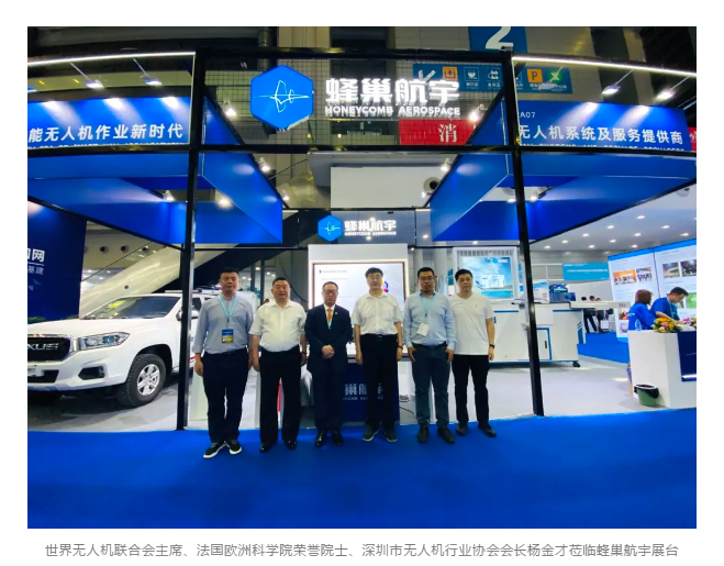 2021世界無人機大會執行主席、深圳市無人機行業協會會長、歐洲科學、藝術與人文學院榮譽院士楊金才,中國民用航空局原局長、12屆全國政協文化和學習委員會副主任李家祥等領導蒞臨蜂巢航宇展位親切指導。北京航空航天大學無人機協會會長等領導在世界無人機大會現場與蜂巢航宇進行了親切交流。