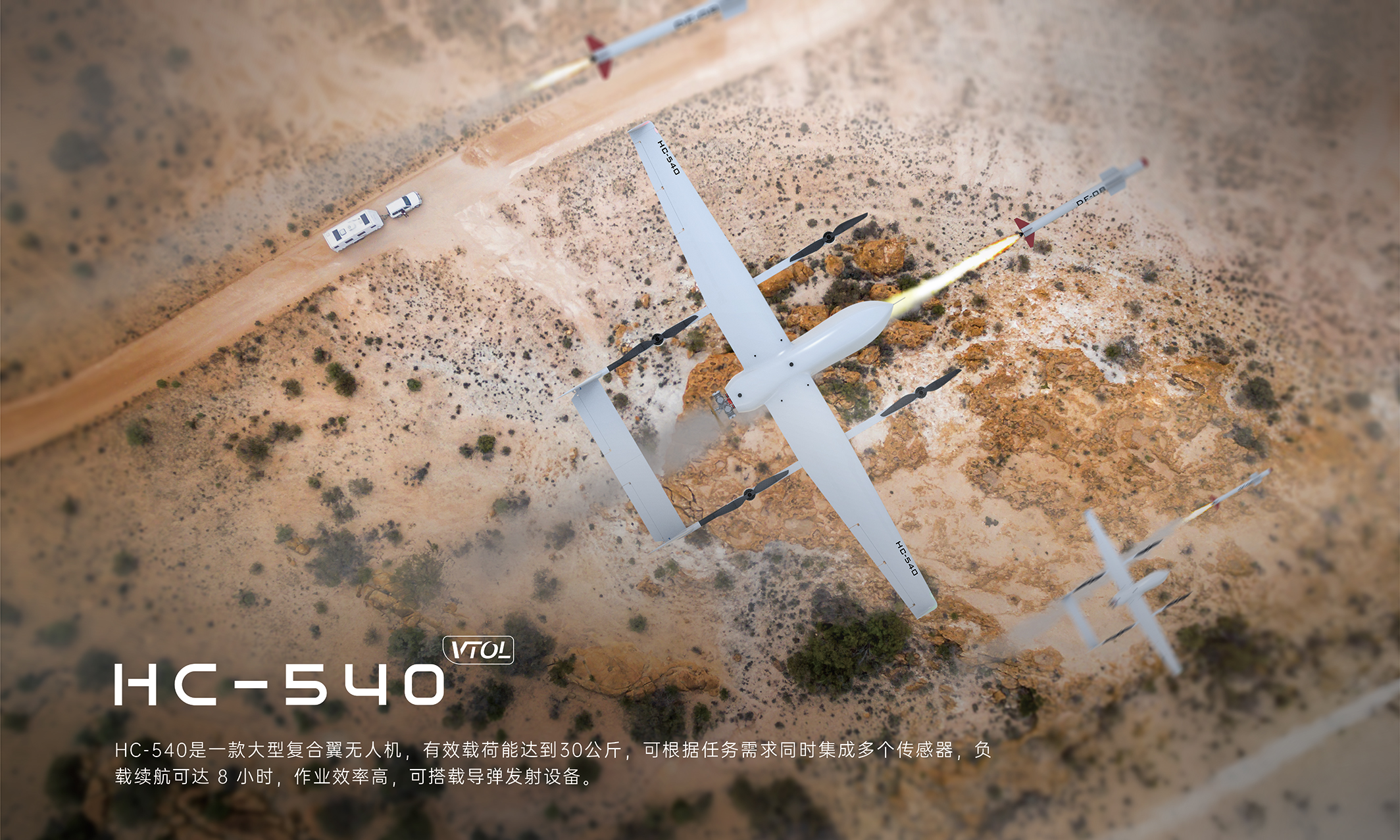 HC-540是蜂巢航宇最新研發的一款大型垂直起降固定翼無人機。其采用油電混合動力系統,有效載荷達到30kg,最大續航可達8小時,同時可搭載導彈發射設備。