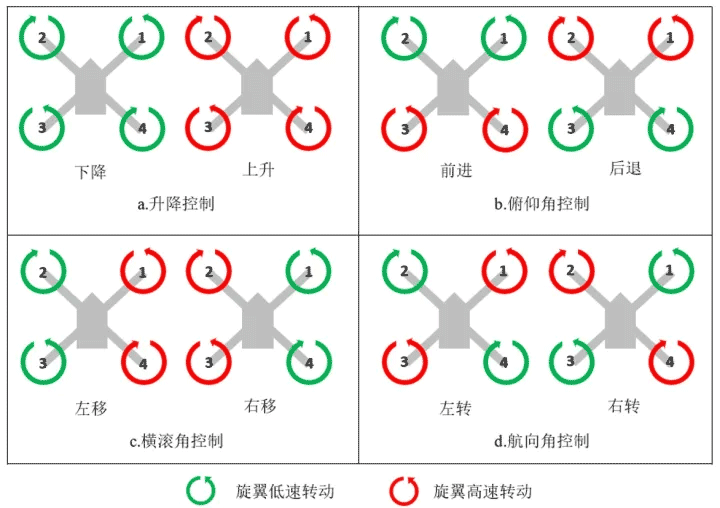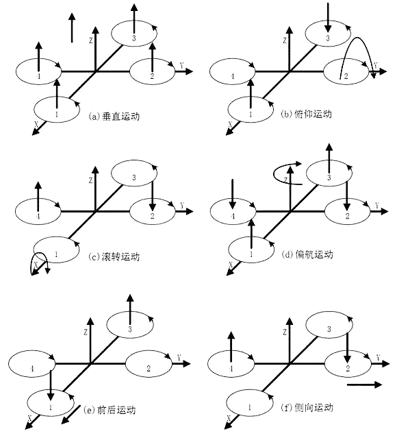 偏航運動飛行原理:如圖d所示,當一對正轉旋翼與一對反轉旋翼轉速相同時,產生的扭矩則相互抵消,無人機不旋轉。和當1、3號旋翼轉速增大而2、4號旋翼轉速不變時,1、3號旋翼對機體產生的扭矩大于2、4號旋翼的反扭矩,因此無人機將繞Z軸進行逆時針旋轉;反之,當2、4號旋翼轉速大于1、3號旋翼轉速時,無人機將繞Z軸順時針旋轉。