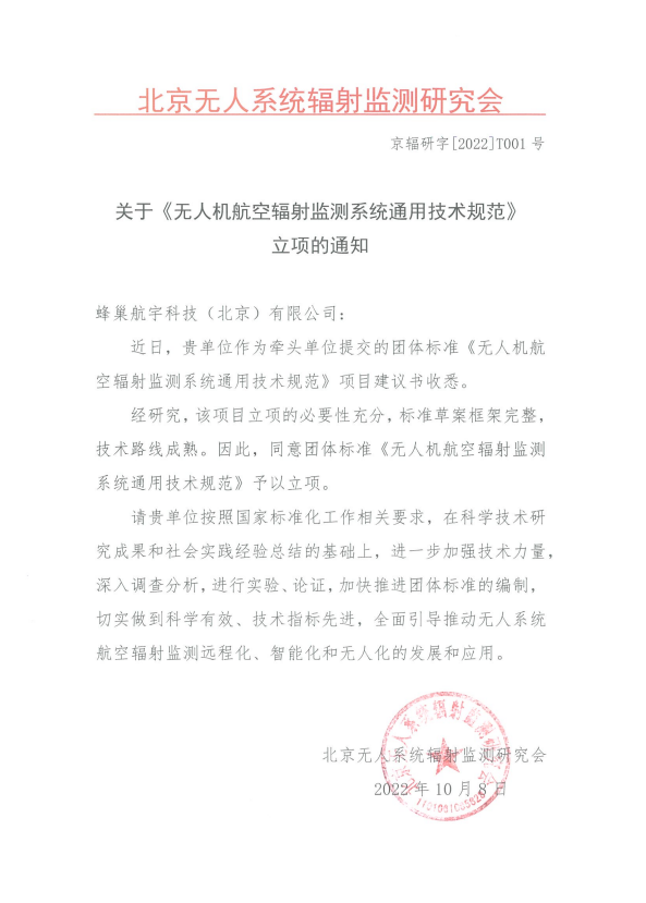2022年10月8日,以蜂巢航宇牽頭的《無人機航空輻射監測系統通用技術規范》團體標準正式立項。