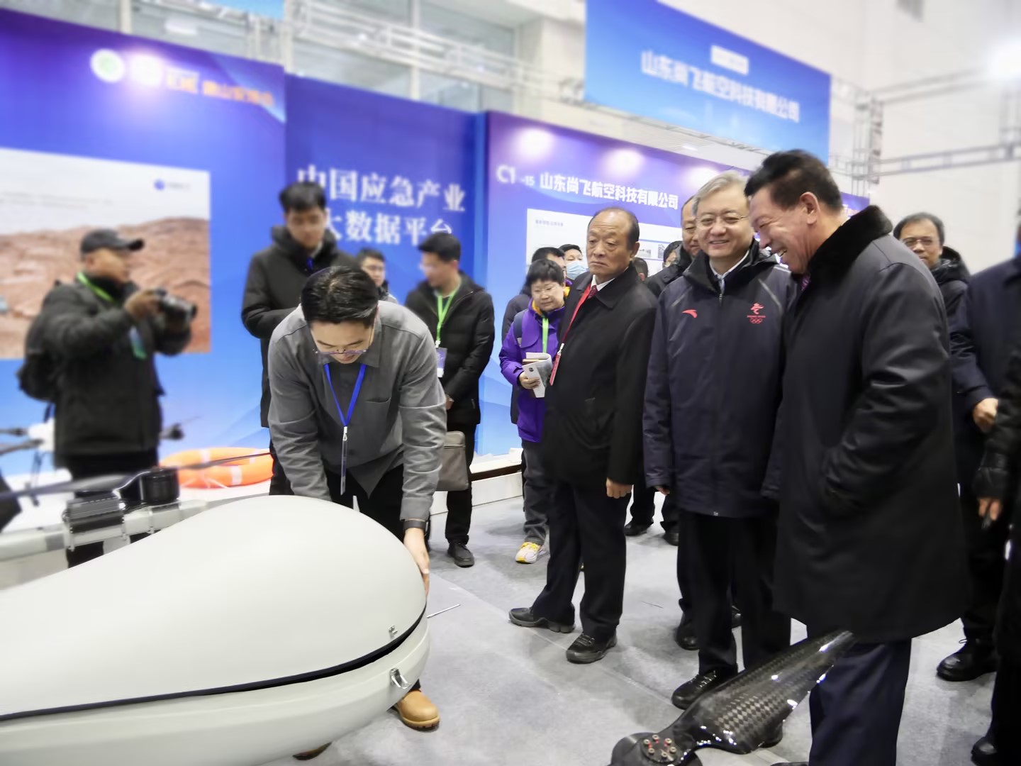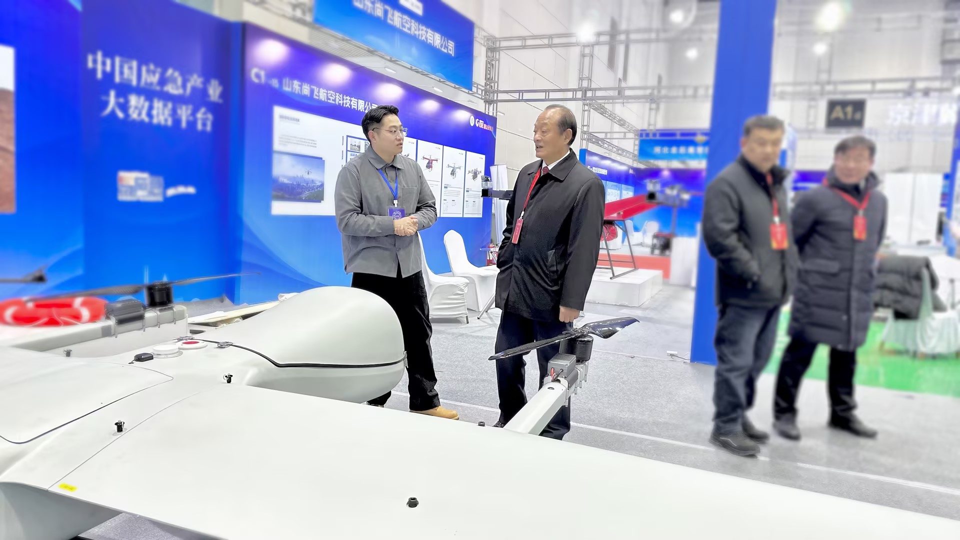 唐山市應急管理局黨委書記顧俊旺蒞臨蜂巢航宇展位參觀指導,并就應急通信復合翼無人機技術創新、應急安全產業應用場景等方面的情況進行了詳細了解。