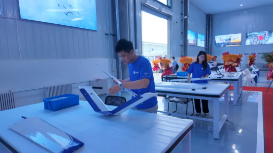 After the inauguration ceremony, Wang Jianwu, Deputy General Manager of Honeycomb Aerospace, led the guests on a tour of the assembly line for long-endurance V fixed-wing UAVs at Honeycomb Aerospace Inner Mongolia Company. This production line is capable of mass-producing multiple types of UAV products, fully demonstrating the enterprise's solid strength in high-end equipment manufacturing.