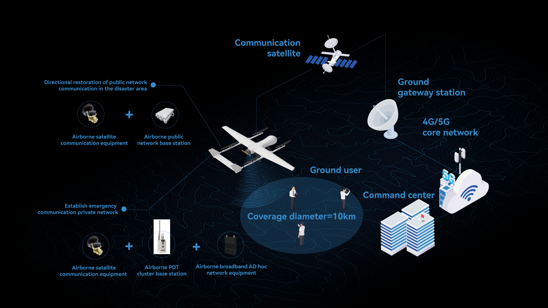 HC-541 adopts a composite vertical take-off and landing fixed wing layout, the fuselage is molded from carbon fiber and foam sandwich, the structure is light weight and high strength, and the wing and tail are removable design. It can carry photoelectric cameras, rapid 3D modeling payloads, airborne public network base stations, airborne PDT cluster base stations, airborne broadband AD hoc networking equipment, airborne satellite communication equipment, airborne personnel search and rescue payloads, etc., and can be applied to emergency communication, reconnaissance aerial survey and other scenarios.